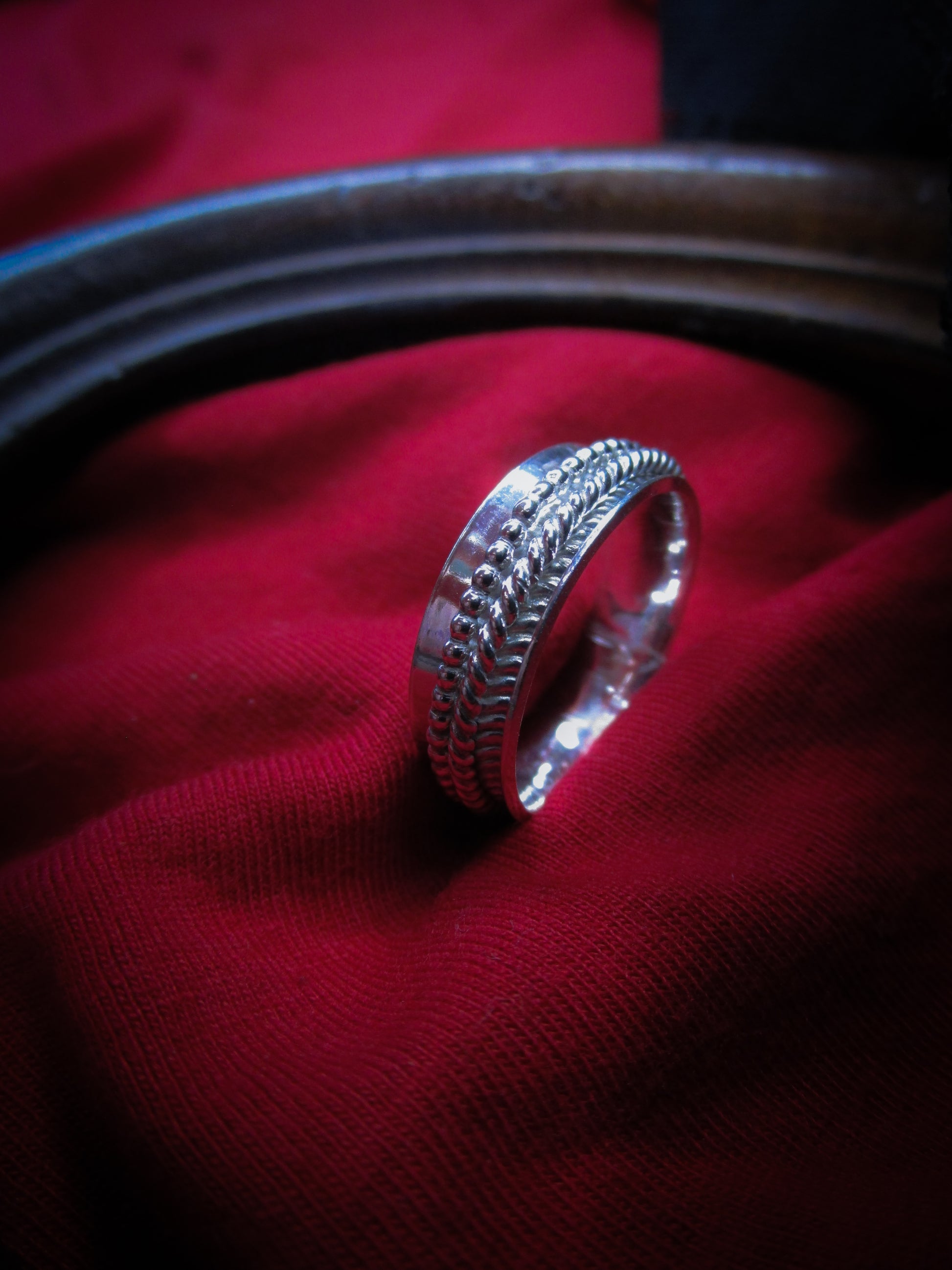 La fascia che sta alla base é liscia e luminosa, mentre le due decorazioni mobili hanno un’estetica di altri tempi. Il suono prodotto da questo anello è leggiadro e rilassante come una cascata che scrocia.